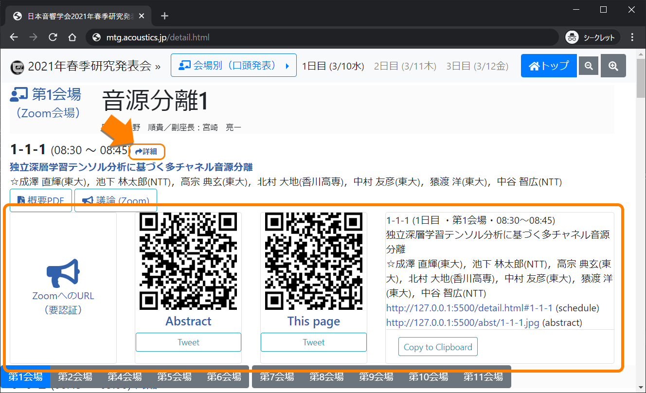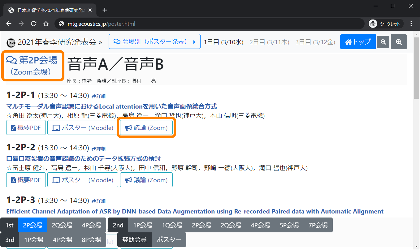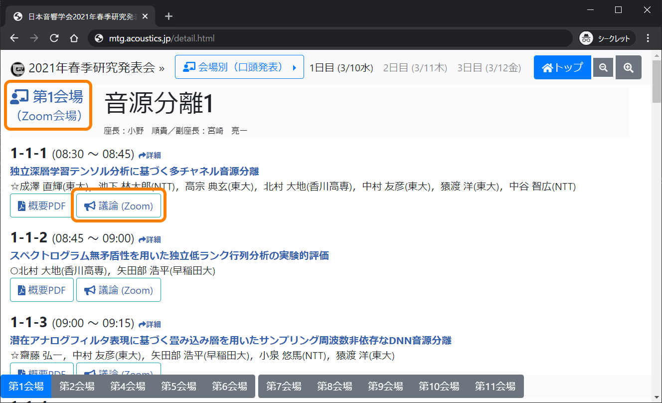 - 口頭発表会場別ページへアクセスし、目的の会場を表示します。