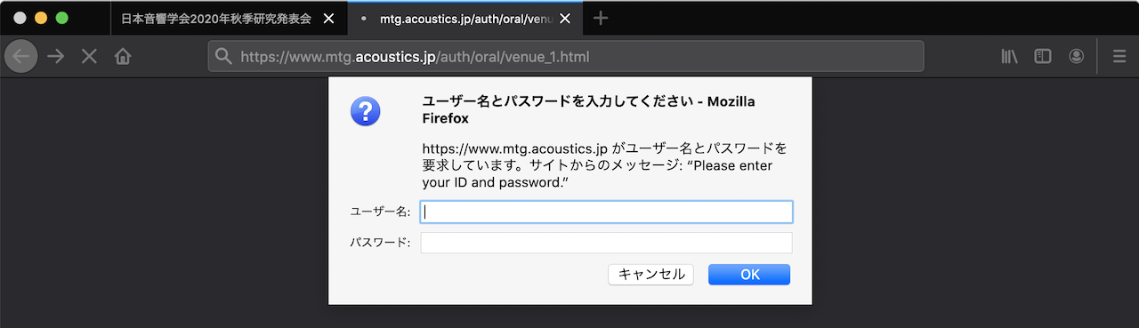 誤ってキャンセルボタンを押すなどして認証に失敗したら、ブラウザの更新ボタン(または、F5 / Ctrl+R)を押下することで、再度ダイアログを表示できます。